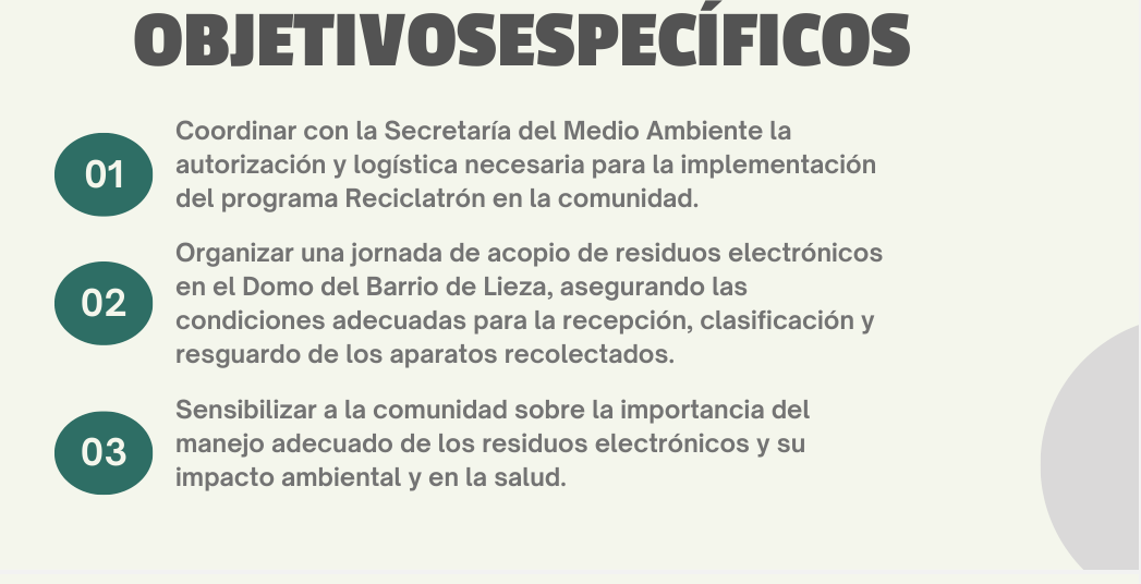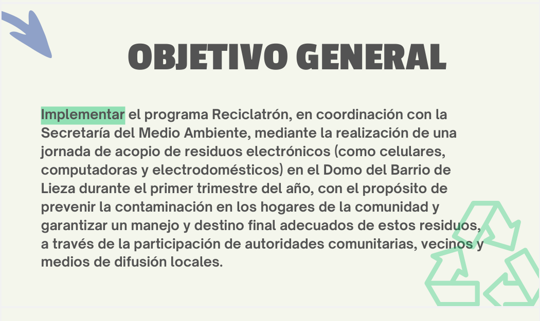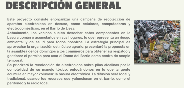 Este proyecto consiste en organizar. una campaña de recolección de aparatos electrónicos en desuso, como celulares, computadoras y electrodomésticos, en el Barrio de Lieza.